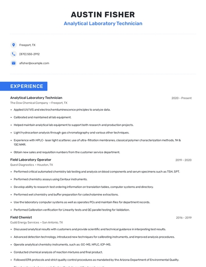 Build a professional analytical laboratory technician resume in minutes. Browse through our resume examples to identify the best way to word your resume. Then choose from 5+ resume templates to create your analytical laboratory technician resume.