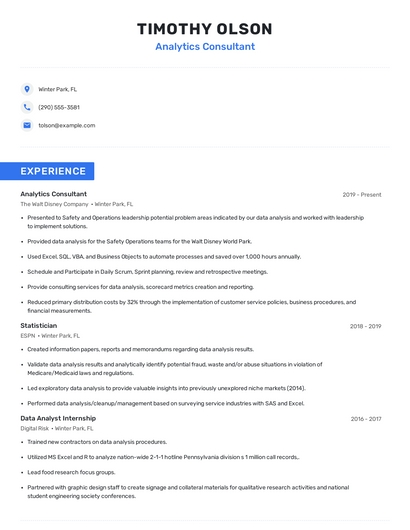 Build a professional analytics consultant resume in minutes. Browse through our resume examples to identify the best way to word your resume. Then choose from 5+ resume templates to create your analytics consultant resume.