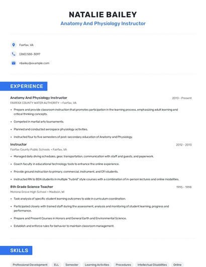 Build a professional anatomy and physiology instructor resume in minutes. Browse through our resume examples to identify the best way to word your resume. Then choose from 5+ resume templates to create your anatomy and physiology instructor resume.