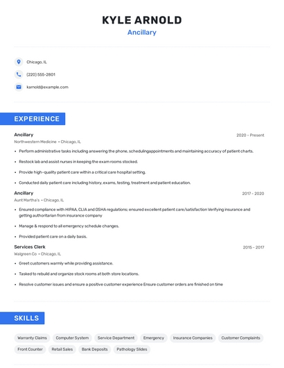 Build a professional ancillary resume in minutes. Browse through our resume examples to identify the best way to word your resume. Then choose from 5+ resume templates to create your ancillary resume.