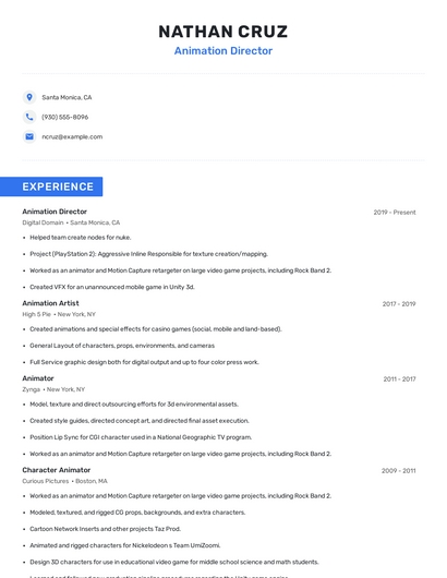 Build a professional animation director resume in minutes. Browse through our resume examples to identify the best way to word your resume. Then choose from 5+ resume templates to create your animation director resume.