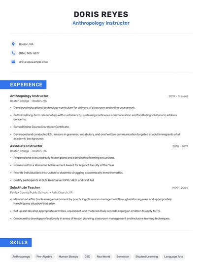Build a professional anthropology instructor resume in minutes. Our AI resume writing assistant will guide you through every step of the process, and you can choose from 10+ resume templates to create your anthropology instructor resume.7. Student Performance