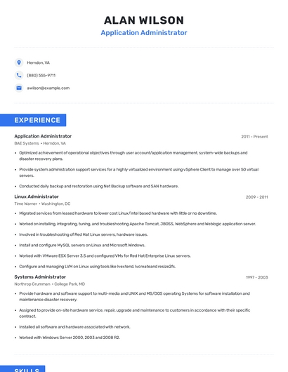 Build a professional application administrator resume in minutes. Browse through our resume examples to identify the best way to word your resume. Then choose from 5+ resume templates to create your application administrator resume.