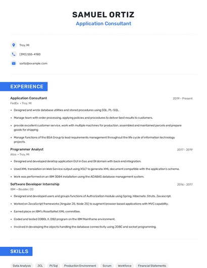 Build a professional application consultant resume in minutes. Browse through our resume examples to identify the best way to word your resume. Then choose from 5+ resume templates to create your application consultant resume.