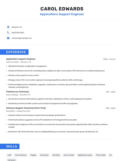 Build a professional applications support engineer resume in minutes. Our AI resume writing assistant will guide you through every step of the process, and you can choose from 10+ resume templates to create your applications support engineer resume.7. Troubleshoot