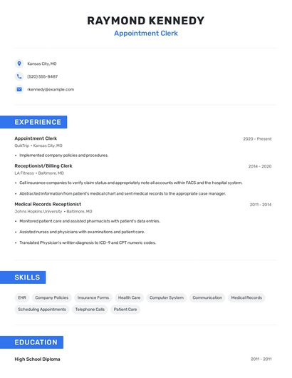 Build a professional appointment clerk resume in minutes. Browse through our resume examples to identify the best way to word your resume. Then choose from 5+ resume templates to create your appointment clerk resume.