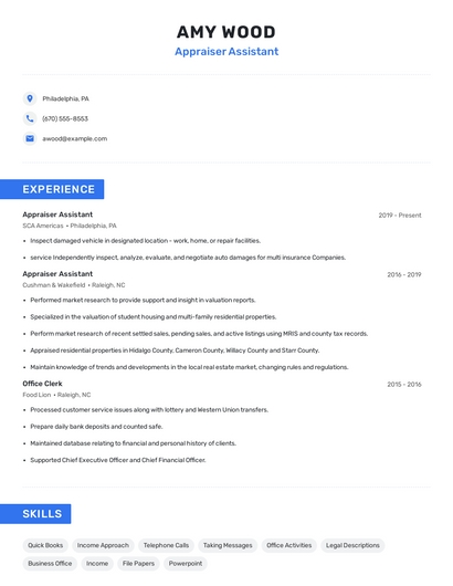 Build a professional appraiser assistant resume in minutes. Browse through our resume examples to identify the best way to word your resume. Then choose from 5+ resume templates to create your appraiser assistant resume.