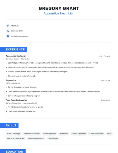 Build a professional apprentice electrician resume in minutes. Browse through our resume examples to identify the best way to word your resume. Then choose from 5+ resume templates to create your apprentice electrician resume.