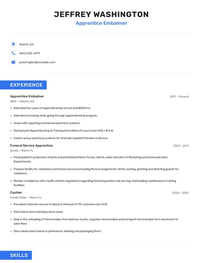 The most important skills for an apprentice embalmer resume and required skills for an apprentice embalmer to have include: