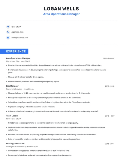 Build a professional area operations manager resume in minutes. Browse through our resume examples to identify the best way to word your resume. Then choose from 5+ resume templates to create your area operations manager resume.