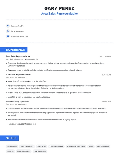 Build a professional area sales representative resume in minutes. Browse through our resume examples to identify the best way to word your resume. Then choose from 5+ resume templates to create your area sales representative resume.