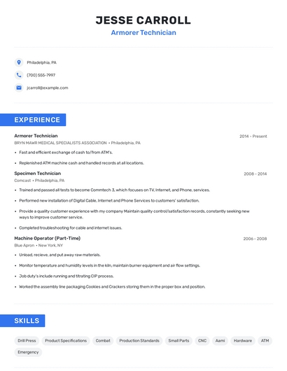 The most important skills for an armorer technician resume and required skills for an armorer technician to have include: