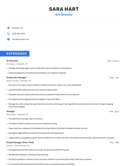Build a professional art director resume in minutes. Browse through our resume examples to identify the best way to word your resume. Then choose from 5+ resume templates to create your art director resume.