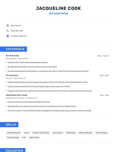 Build a professional art internship resume in minutes. Browse through our resume examples to identify the best way to word your resume. Then choose from 5+ resume templates to create your art internship resume.