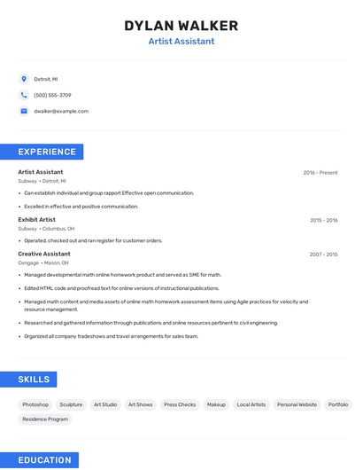 Build a professional artist assistant resume in minutes. Browse through our resume examples to identify the best way to word your resume. Then choose from 5+ resume templates to create your artist assistant resume.