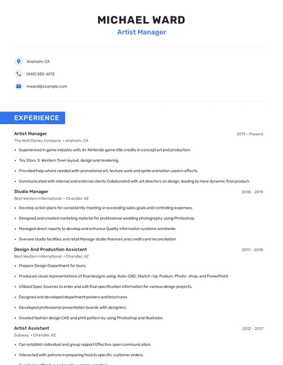Build a professional artist manager resume in minutes. Browse through our resume examples to identify the best way to word your resume. Then choose from 5+ resume templates to create your artist manager resume.