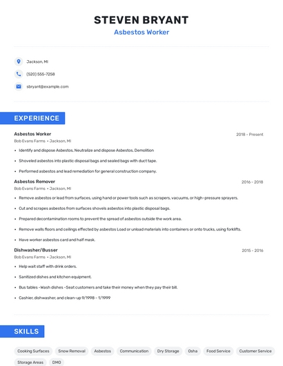 Build a professional asbestos worker resume in minutes. Browse through our resume examples to identify the best way to word your resume. Then choose from 5+ resume templates to create your asbestos worker resume.