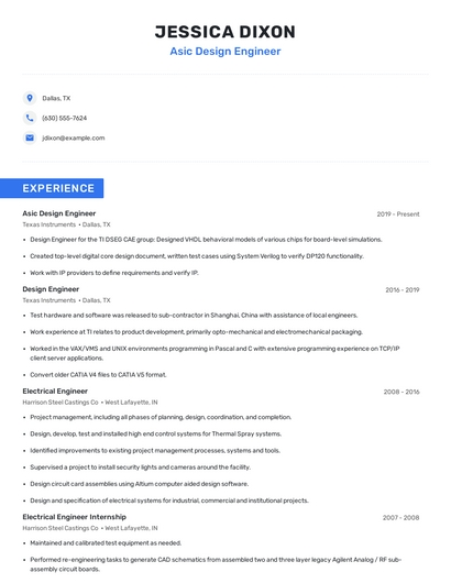 Build a professional asic design engineer resume in minutes. Browse through our resume examples to identify the best way to word your resume. Then choose from 5+ resume templates to create your asic design engineer resume.