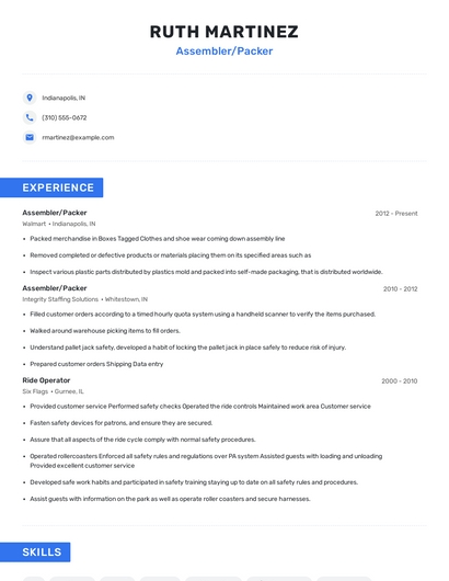 Build a professional assembler/packer resume in minutes. Browse through our resume examples to identify the best way to word your resume. Then choose from 5+ resume templates to create your assembler/packer resume.