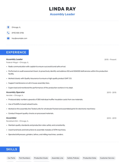 Build a professional assembly leader resume in minutes. Browse through our resume examples to identify the best way to word your resume. Then choose from 5+ resume templates to create your assembly leader resume.