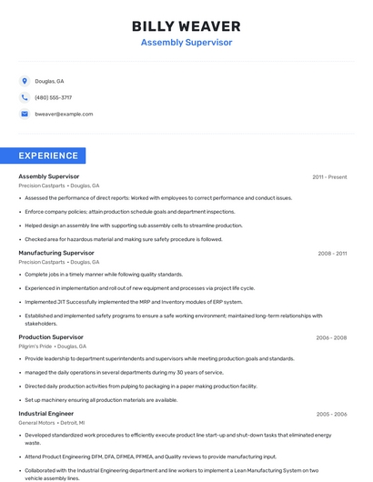Build a professional assembly supervisor resume in minutes. Browse through our resume examples to identify the best way to word your resume. Then choose from 5+ resume templates to create your assembly supervisor resume.
