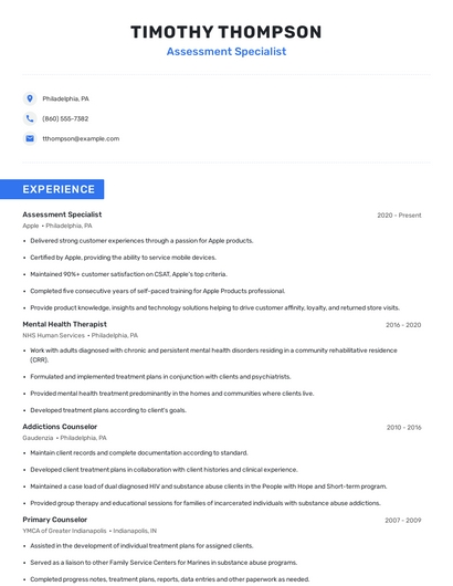 Build a professional assessment specialist resume in minutes. Browse through our resume examples to identify the best way to word your resume. Then choose from 5+ resume templates to create your assessment specialist resume.