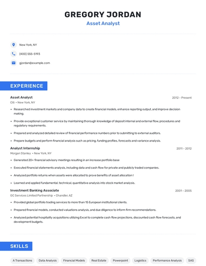 Build a professional asset analyst resume in minutes. Browse through our resume examples to identify the best way to word your resume. Then choose from 5+ resume templates to create your asset analyst resume.