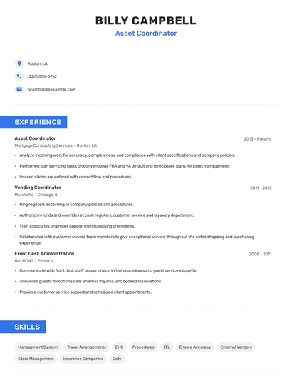 Build a professional asset coordinator resume in minutes. Browse through our resume examples to identify the best way to word your resume. Then choose from 5+ resume templates to create your asset coordinator resume.