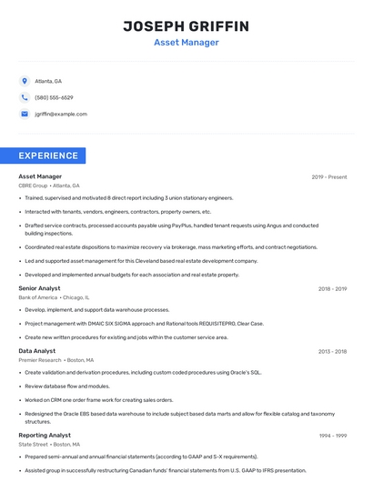 Build a professional asset manager resume in minutes. Browse through our resume examples to identify the best way to word your resume. Then choose from 5+ resume templates to create your asset manager resume.