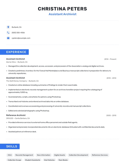 Build a professional assistant archivist resume in minutes. Browse through our resume examples to identify the best way to word your resume. Then choose from 5+ resume templates to create your assistant archivist resume.
