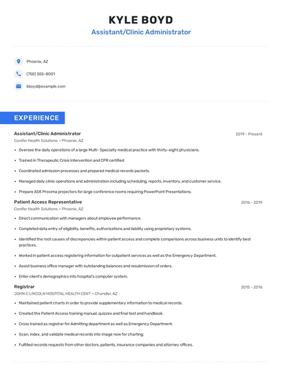 Build a professional assistant/clinic administrator resume in minutes. Our AI resume writing assistant will guide you through every step of the process, and you can choose from 10+ resume templates to create your assistant/clinic administrator resume.7. CPR
