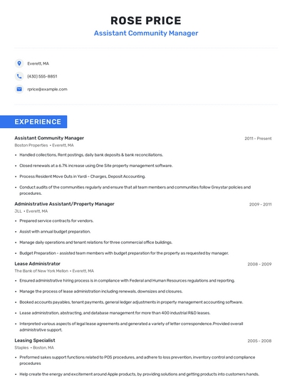 Build a professional assistant community manager resume in minutes. Browse through our resume examples to identify the best way to word your resume. Then choose from 5+ resume templates to create your assistant community manager resume.