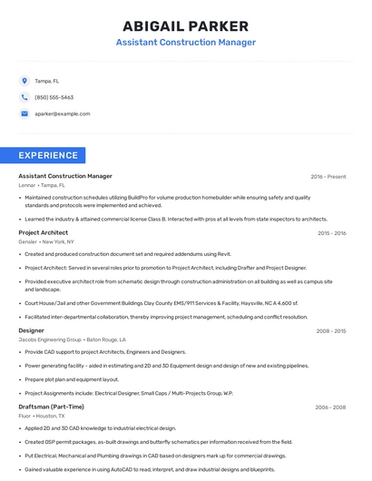 Build a professional assistant construction manager resume in minutes. Browse through our resume examples to identify the best way to word your resume. Then choose from 5+ resume templates to create your assistant construction manager resume.