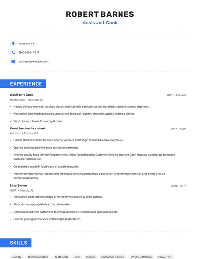Build a professional assistant cook resume in minutes. Browse through our resume examples to identify the best way to word your resume. Then choose from 5+ resume templates to create your assistant cook resume.