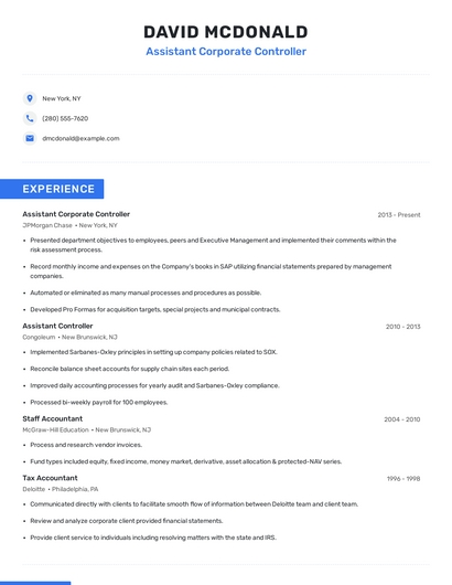 Build a professional assistant corporate controller resume in minutes. Browse through our resume examples to identify the best way to word your resume. Then choose from 5+ resume templates to create your assistant corporate controller resume.