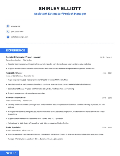 Choose from 10+ customizable assistant estimator/project manager resume templates