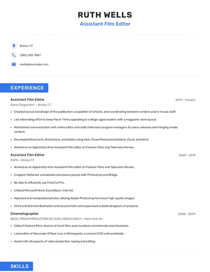 Build a professional assistant film editor resume in minutes. Our AI resume writing assistant will guide you through every step of the process, and you can choose from 10+ resume templates to create your assistant film editor resume.What skills help Assistant Film Editors find jobs?