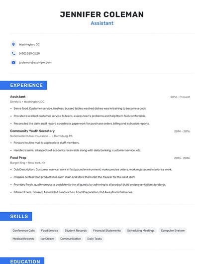 Build a professional assistant resume in minutes. Browse through our resume examples to identify the best way to word your resume. Then choose from 5+ resume templates to create your assistant resume.