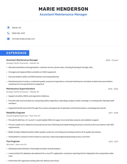 Build a professional assistant maintenance manager resume in minutes. Browse through our resume examples to identify the best way to word your resume. Then choose from 5+ resume templates to create your assistant maintenance manager resume.