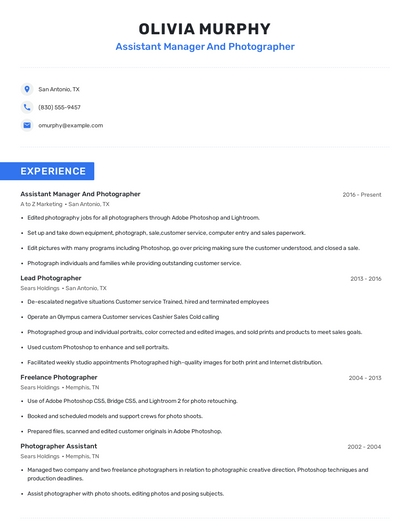 Build a professional assistant manager and photographer resume in minutes. Browse through our resume examples to identify the best way to word your resume. Then choose from 5+ resume templates to create your assistant manager and photographer resume.