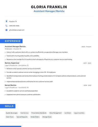 Build a professional assistant manager/barista resume in minutes. Browse through our resume examples to identify the best way to word your resume. Then choose from 5+ resume templates to create your assistant manager/barista resume.