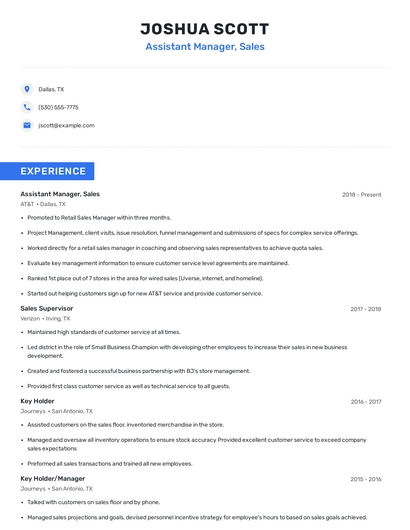 Build a professional assistant manager, sales resume in minutes. Our AI resume writing assistant will guide you through every step of the process, and you can choose from 10+ resume templates to create your assistant manager, sales resume.7. Store Sales