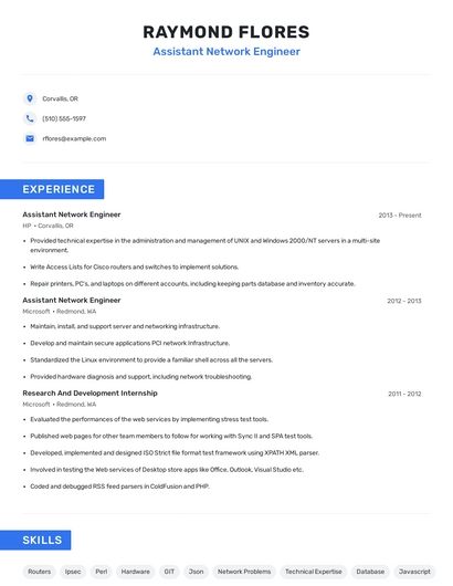 Build a professional assistant network engineer resume in minutes. Browse through our resume examples to identify the best way to word your resume. Then choose from 5+ resume templates to create your assistant network engineer resume.