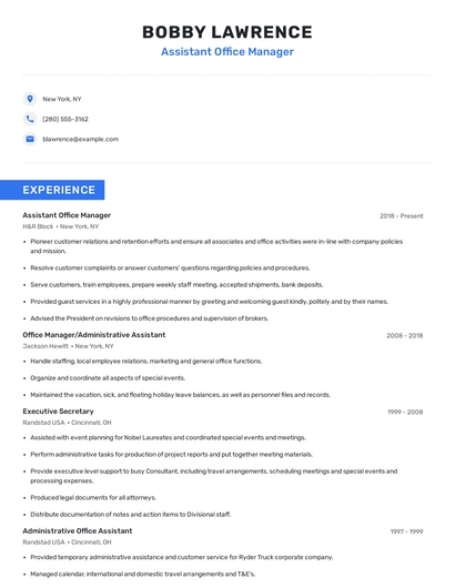 Build a professional assistant office manager resume in minutes. Browse through our resume examples to identify the best way to word your resume. Then choose from 5+ resume templates to create your assistant office manager resume.