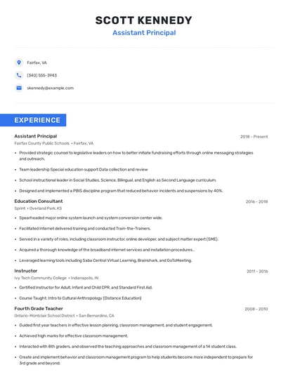 Build a professional assistant principal resume in minutes. Browse through our resume examples to identify the best way to word your resume. Then choose from 5+ resume templates to create your assistant principal resume.