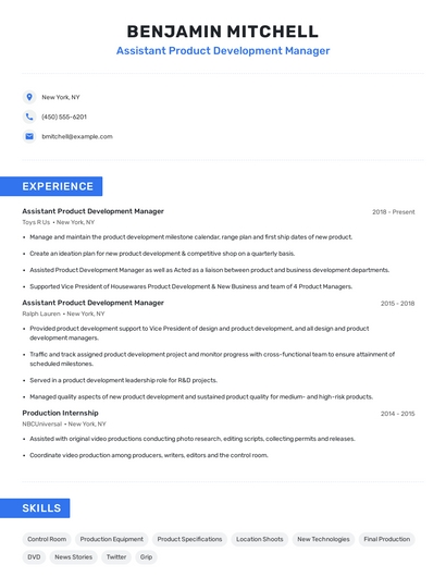 Build a professional assistant product development manager resume in minutes. Browse through our resume examples to identify the best way to word your resume. Then choose from 5+ resume templates to create your assistant product development manager resume.