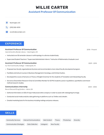 Build a professional assistant professor of communication resume in minutes. Browse through our resume examples to identify the best way to word your resume. Then choose from 5+ resume templates to create your assistant professor of communication resume.