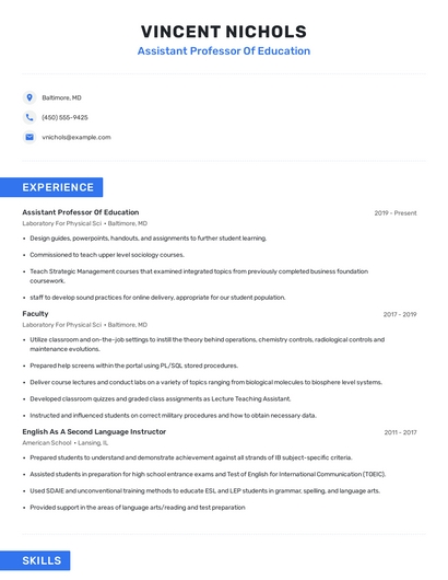 Build a professional assistant professor of education resume in minutes. Browse through our resume examples to identify the best way to word your resume. Then choose from 5+ resume templates to create your assistant professor of education resume.