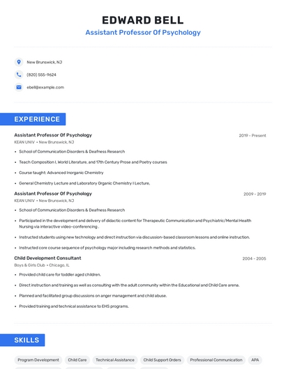 Build a professional assistant professor of psychology resume in minutes. Browse through our resume examples to identify the best way to word your resume. Then choose from 5+ resume templates to create your assistant professor of psychology resume.