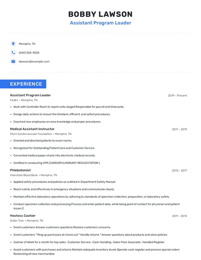 Build a professional assistant program leader resume in minutes. Browse through our resume examples to identify the best way to word your resume. Then choose from 5+ resume templates to create your assistant program leader resume.